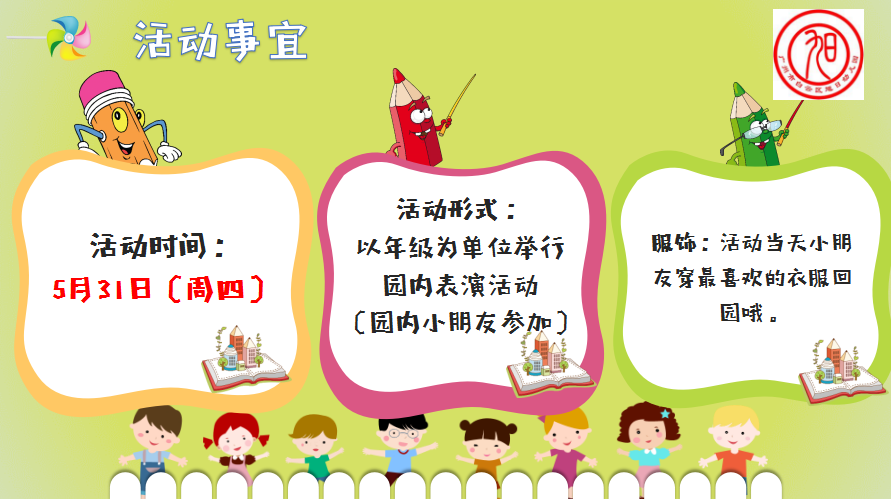 在赏识教育中进步,在爱与陪伴下成长!我园将于201表演8年5月31日(周四)早上,在园内举行“趣享童年,快乐六一”的以年级为单位的主题活动,各班已经在精心准备节目,期待在活动当天精彩表现!